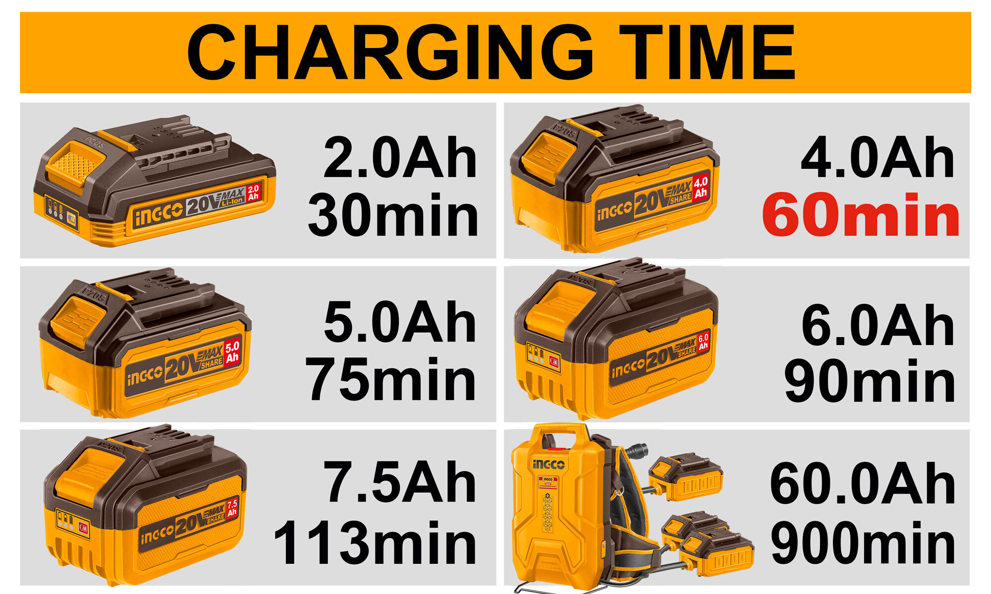 - Время заряда 20В 4.0 Ач. батареи: 60 мин.