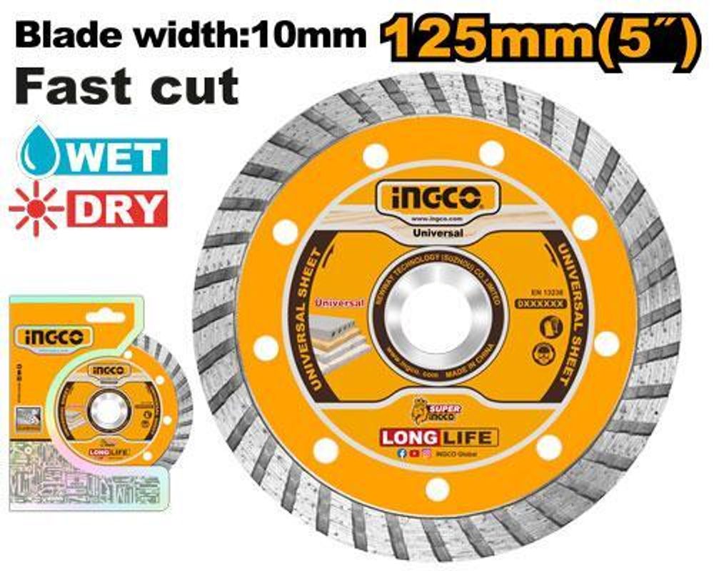 Диск алмазный сегментированный Turbo 125х10х2,5х22 мм INGCO DMD031252 универсальный диск предназначен для сухой и мокрой резки не армированного бетона, гранит, мрамора, кирпича, песчаника, а также тротуарной плитки.