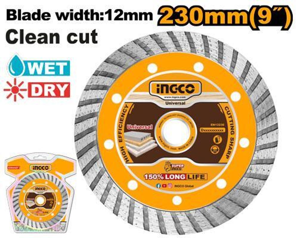 Диск алмазный сегментированный 230 мм INGCO DMD032301 INDUSTRIAL универсальный диск предназначен для сухой и мокрой резки не армированного бетона, гранит, мрамора, кирпича, песчаника, а также тротуарной плитки.
