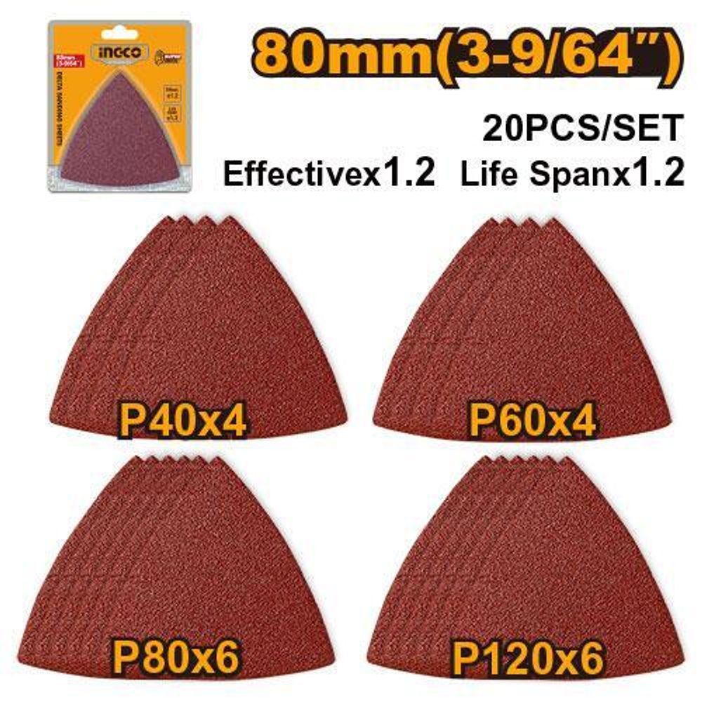 Набор шлифовальных листов дельтавидных 20шт. P40-P120 оксид алюминия INGCO AKTS080201 в наборе 20 шлифлистов, которые служат для шлифовки и зачистки различных материалов.