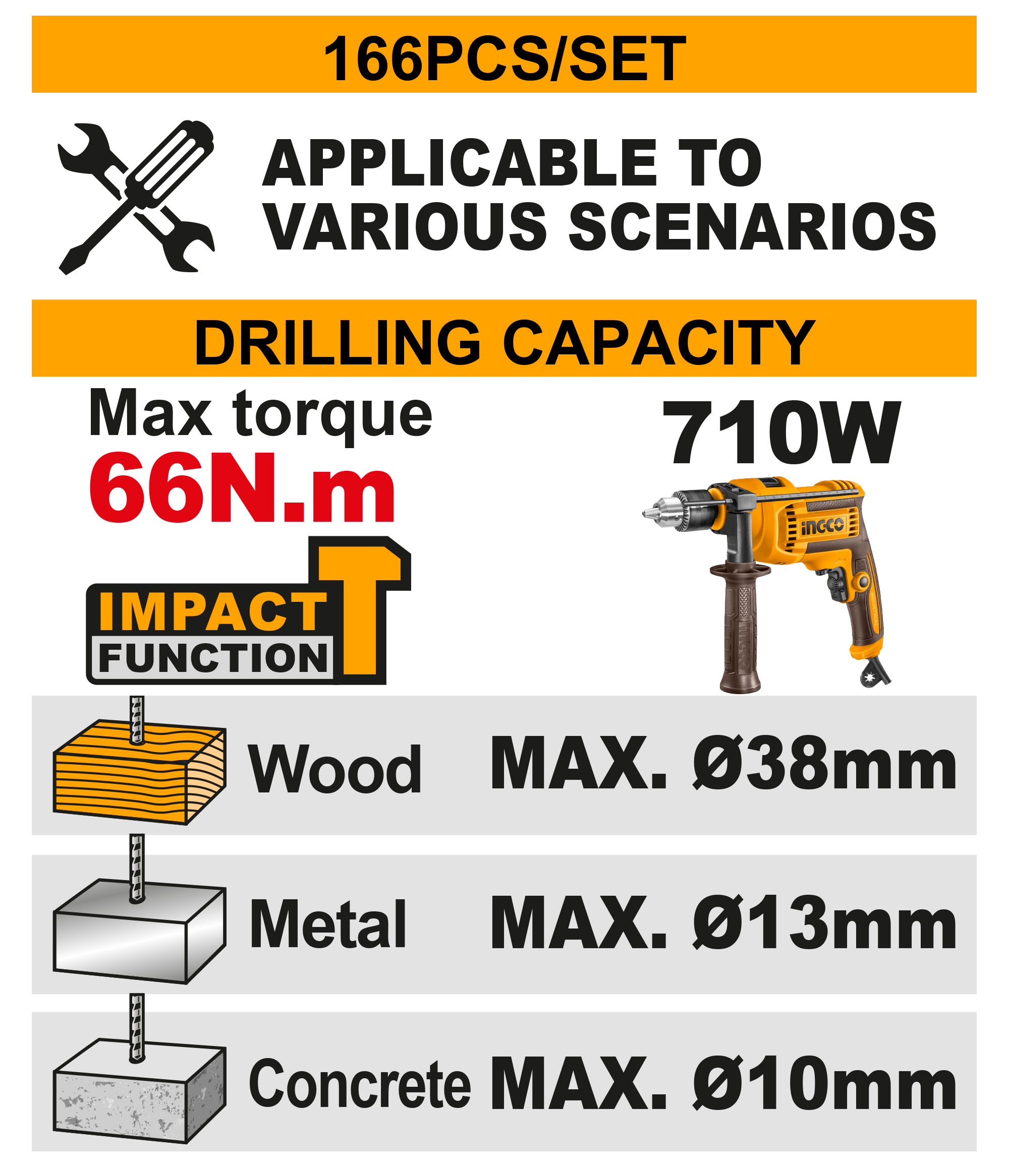 Набор шуруповерта и ручного инструмента 166 шт INGCO HKTHP41662 INDUSTRIAL включает в себя 166 предметов предназначен для бытового применения.