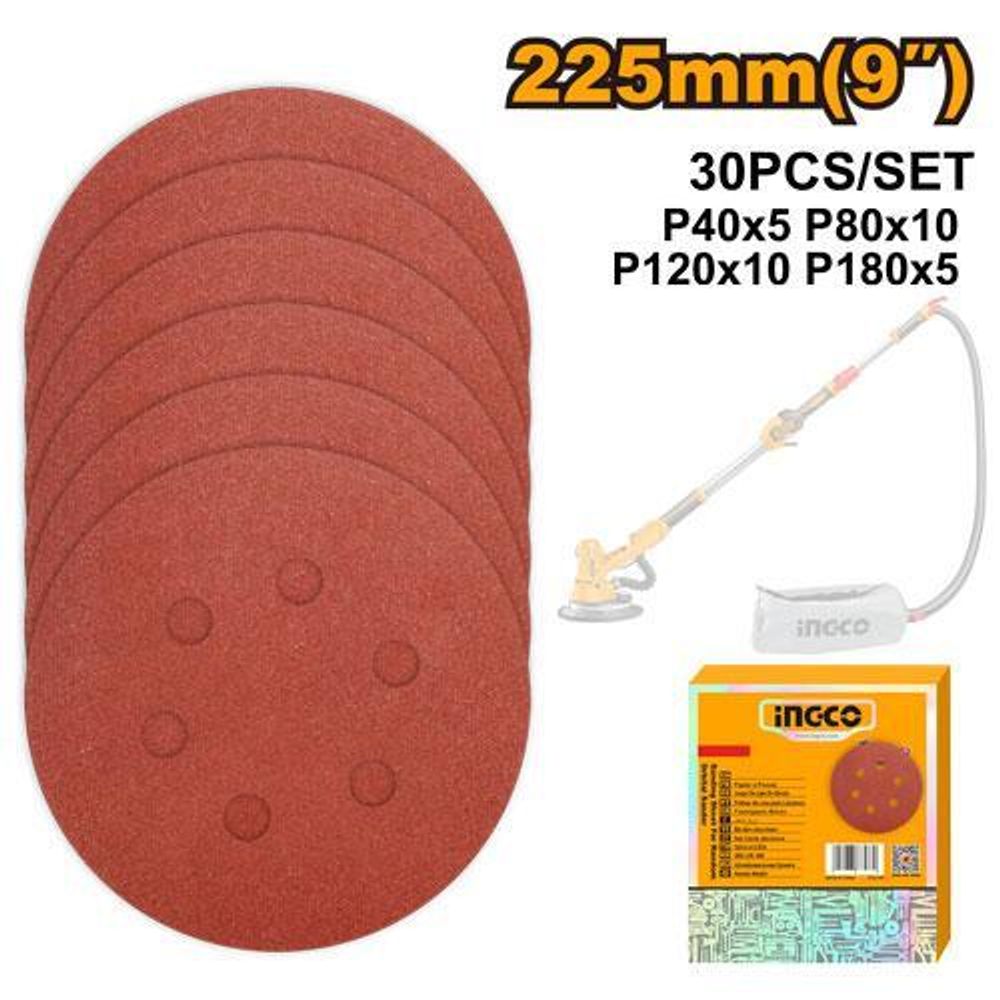 Набор шлифовальных листов 225мм, 30 шт Р40-Р180 INGCO AKRS225030 используется совместно с телескопическими шлифовальными машинами.