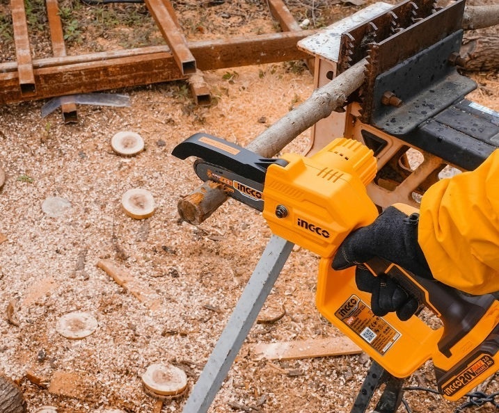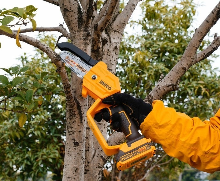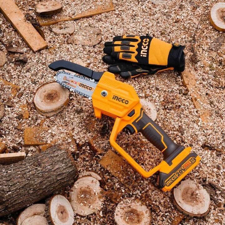 Цепная аккумуляторная мини пила 20В 1хАКБ 2Ач и ЗУ SUPER INGCO CGSLI20581 данная модель специально разработана для работы в саду при уходе за растущими деревьями и работ в кроне дерева, распила и обрезания веток деревьев